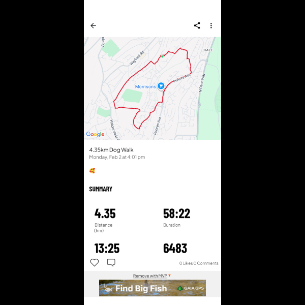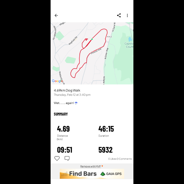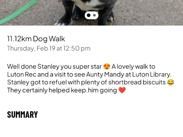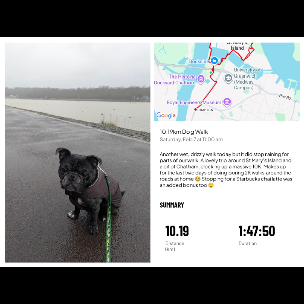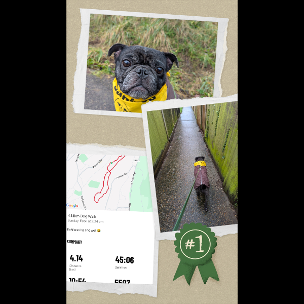 Stanley enjoyed a 4.14k walk, even though we had to jump several puddles due to the intense rain we've had!Thank you to my Sponsors