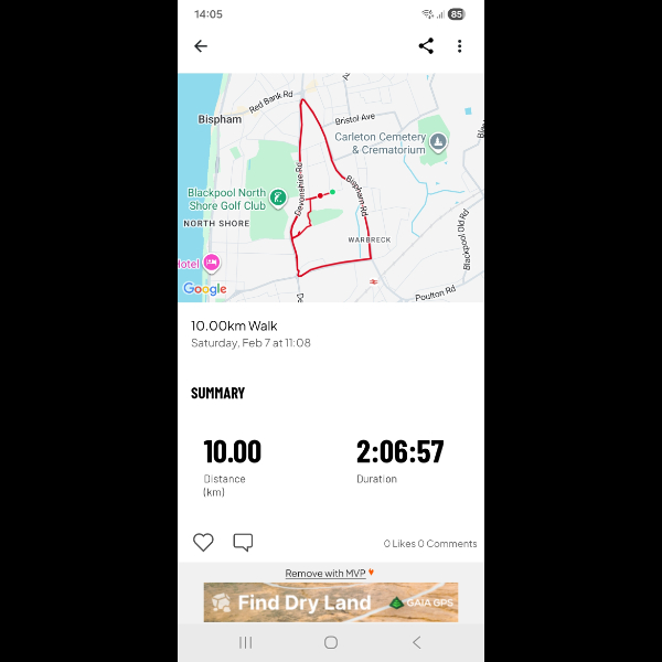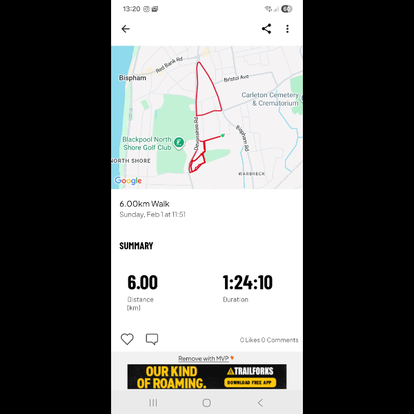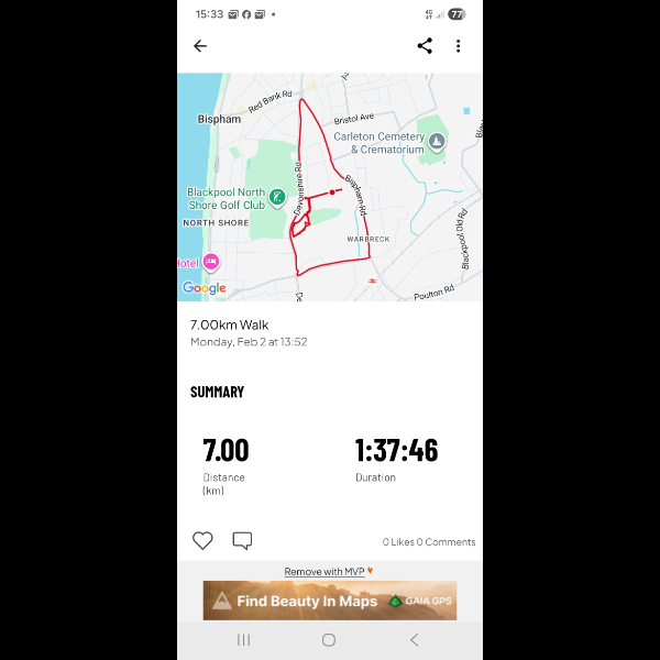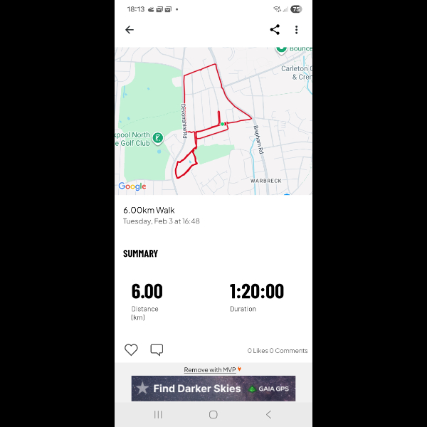 Bit of a late start, so id planned to just walk around my local park as many times as it took me to reach 6km but unfortunately it got too dark so after walking around the park 5 times we ended up walking the streets around in circles, back and forth until we reached 6km which takes me to 19km in 3 days so I only have 80km to do by the end of feb 😁